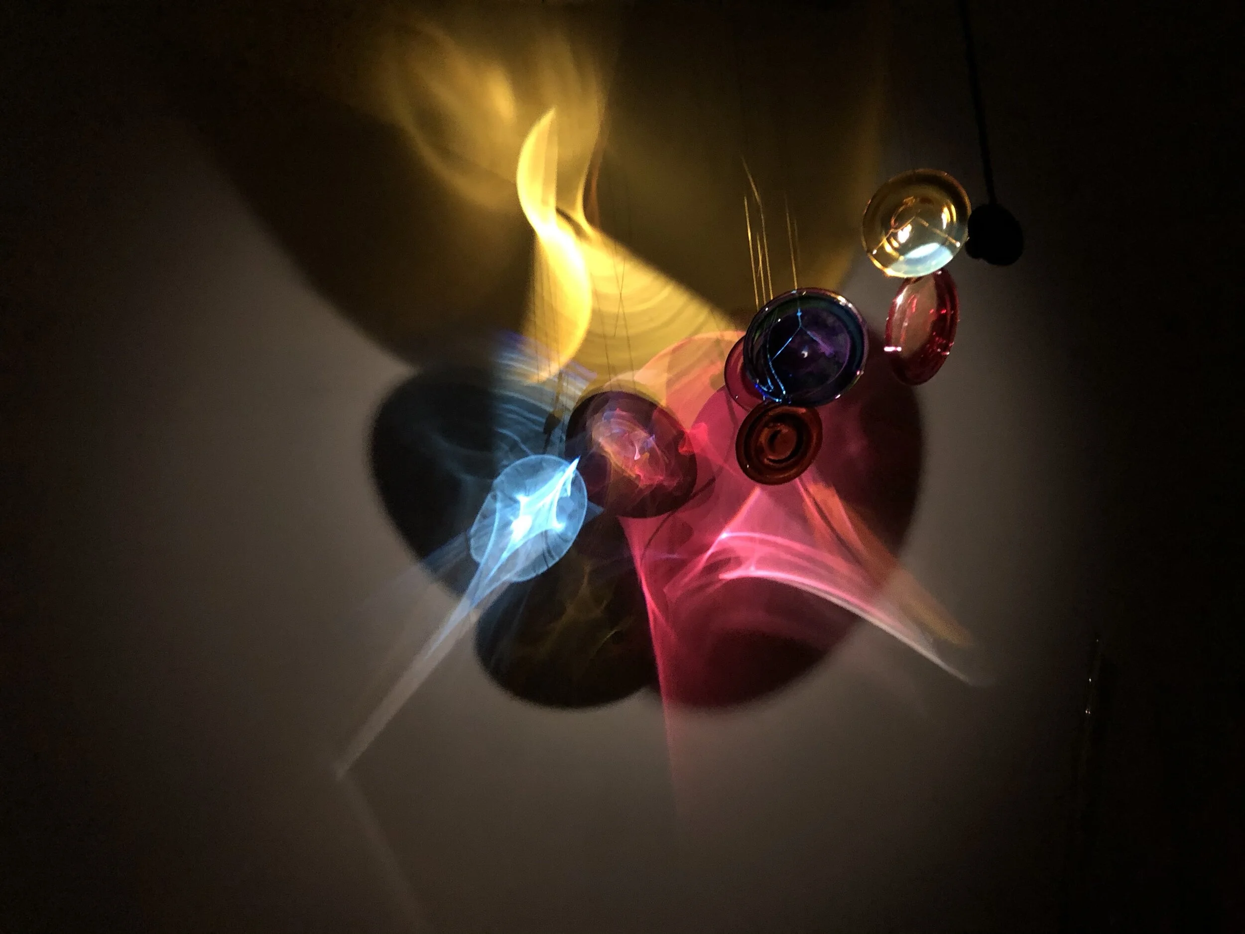 Light-mobiles are satellites that tune the intermediating rays between mind, body and environment. Using suspended hand-blown glass elements they create a kind of visual chord or resonance of light that reverberates in the light cone between the 3D sculpture and the 2D projected image, spatialising the fundamental photographic process of light mediated by the lens.
